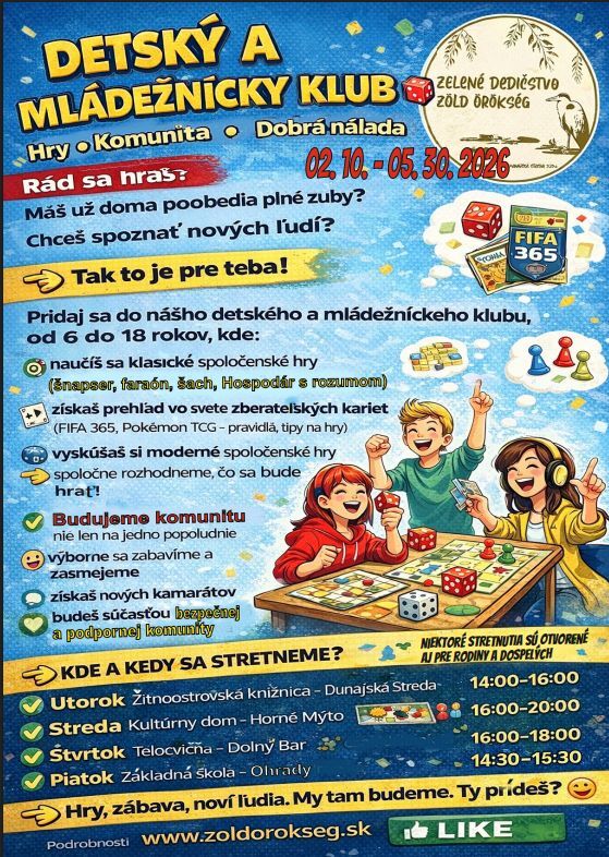 4 mesačným pilotným projektom chceme naštartovať kluby stolových hier na niekoľko rokov. Deti a mládež chceme pomocou spoločenských stolových hier naučiť budovať spoluprácu, etiketu, fair-play, dočasne prehrávať, a že sa logikou a výdržou napokon dá predsalen vyhrať. Najsť pritom spoločné záľuby medzi sebou a budovať tímy ktoré budú základom dospelého života a budúcnosti Slovenska. Dobrovoľnici našeho OZ budu učiť záujemcov medzi 6-18 rokov základom klasických stolových hier ako sú napríklad šnapser, faraon, šach, hospodár s rozumom, ale aj novodobým moderným hrám ako sú stolová hra FIFA 365, a kartová hra Pokemon po slovensky aj maďarsky. Cieľ je sa dobre spoločne zabaviť, a budovať tým spoločnú komunitu.