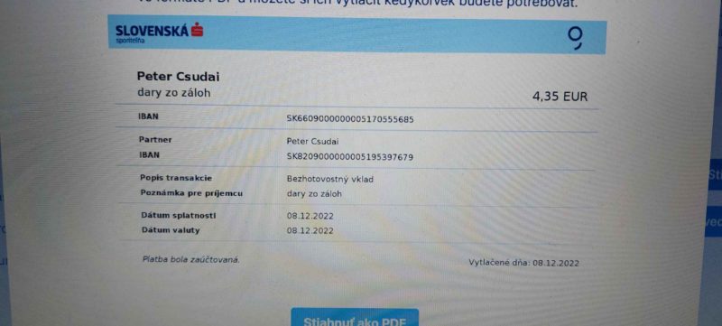 Dnes 8/12/2022 sme po prvý krát odovzdali zálohované obaly, na pre to určenom mieste. Ďakujeme Vám ktorí ste vyhodením obalov u nás podporili OZ. Tentokrát sa nazbierala suma 4,35 EUR, ktorú som previedol z podnikateľského účtu Peter Csudai na účet Občianskeho združenia. V budúcnosti môžete nájsť špeciálne označené vrece pre tento účel pri predajnom pulte, kde si budete môcť kúpiť okrem nápojov aj predmety s logom združenia. sezonálny tovar a zároveň sa budete môcť informovať o prebiehajúcich projektoch združenia. Veľmi sa na vás tešíme!