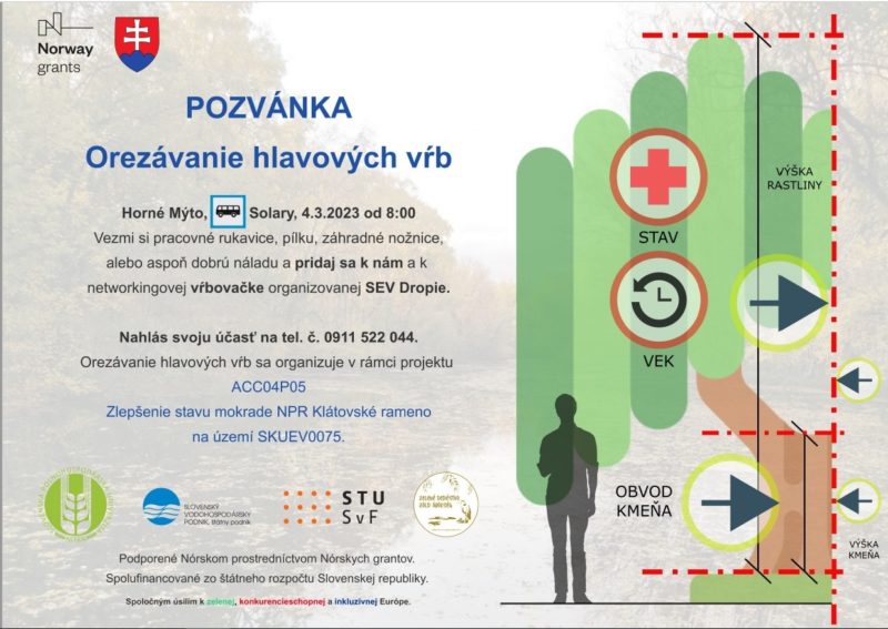 Kto by sa chcel zúčastniť tohto ročného orezávania vŕb v spolupráci s našim občianským združením, môže sa prihlásiť na csudaip@gmail.com . Tohto ročné orezávanie je naplánované v jednotný dátum s orezávaním v areáli SEV Dropie, na ich príklad. V daný deň budú orezávania pri Soliaroch, v SEV Dropie a aj pri obci Ohrady. Všetci ste srdečne vítaný.